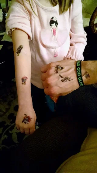 Unfortunately, the cake was pink but he LOVES Newk's strawberry cake. I couldn't resist. At least I could top it with a few black mustaches to give it some manlihood? We also had a few stacks of Teenage Mutant Ninja Turtle rub-on tats that the kids were loving (thanks for this recommendation, Katy Jo).